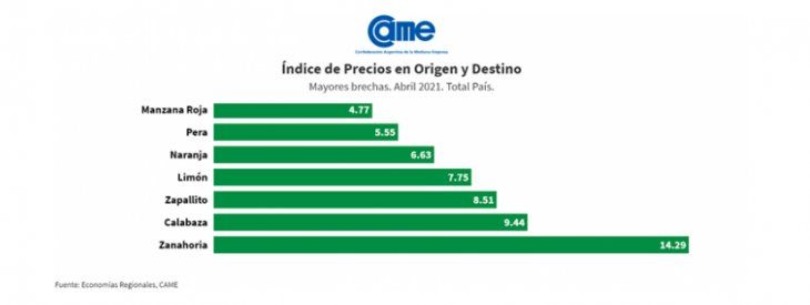 La diferencia de precios entre lo que pagó el consumidor y lo que recibió el productor en el campo por sus alimentos agropecuarios subió 8,7% en abril, según un informe elaborado hoy por la Cámara Argentina de la Mediana Empresa (CAME). De esa manera, el consumidor pagó en góndola 14,3 veces más por productos agropecuarios de lo que cobró el productor. En ese sentido, la brecha de precios para el promedio de los 24 principales alimentos agropecuarios que participan de la mesa familiar aumentó 8,7% al subir de 4,29 veces en marzo a 4,67 veces el mes pasado.
